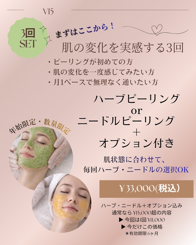 肌と向き合う一年のはじまりに。 まずはここから、無理なく続けるスキンケア。 ピーリングが初めての方や、肌の変化を一度しっかり感じてみたい方に おすすめの3回チケットです。 ⸻ 内容・特徴 ・月1ペースで無理なく通える ・肌状態に合わせて毎回施術内容を調整 ・ピーリング+オプション込みの特別チケット ⸻ こんな方におすすめ ・ピーリングが初めての方 ・肌の変化を一度体感してみたい方 ・定期ケアを始めたい方 ★施術内容 以下より、毎回お選びいただけます ・ハーブピーリング または ・ニードルピーリング + オプション付き(※OPTION MENU参照) ⸻ ★オプションについて オプションの詳細は、別途「OPTION MENU」にてご案内しております。 ※施術ごとに、肌状態に合わせてご提案いたします。