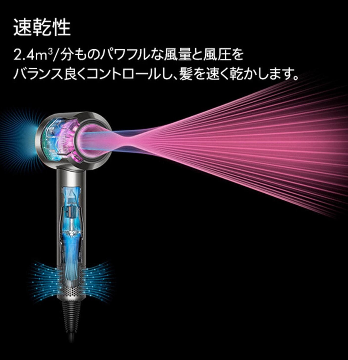 風量2.4m/分と、高速の風ですばやく髪を乾かせる、「ダイソン デジタルモーターV9」を搭載したヘアドライヤー。